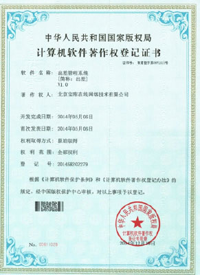 中华人民共和国国家版权局计算机软件著作权登记证书(宝库商旅管理系统V1.0)